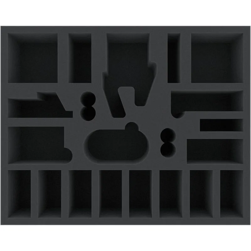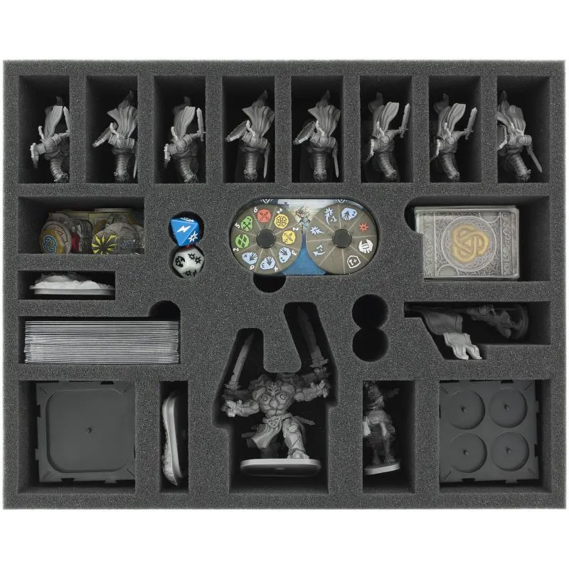 Speziell für die Runewars – Miniaturenspiel geschnittene Einlage. Die 21 Fächer bieten Platz für acht Einheiten der eingeschworenen Kavallerie, für einen Runengolem, den berittenen Lord Hawthorne und der Bannerwache. Alle Figuren werden durch die passgenauen Formen ideal geschützt. In den restlichen neun Plätzen lassen sich Würfel, Bases, Karten in Hüllen, Token und Kommandohalter unterbringen. Die 70 mm Stärke der Matte ergibt sich aus der Nutzhöhe von 60 mm und dem angeklebten 10 mm Boden. 8 Fächer für eingeschworenen Kavallerie 4 Fächer für Bases 2 Fächer für Karten in Hüllen 1 Fach für Bannerwachte 1 Fach für berittenen Lord Hawthorne 1 Fach für die Kommandohalter 1 Fach für Runengolem 1 Fach für Token 1 Fach für Würfel – Abmessung der ganzen Schaumstoffeinlage: 345 x 275 x 70 mm – hochwertiger, feinporiger Schaumstoff – Made in Germany