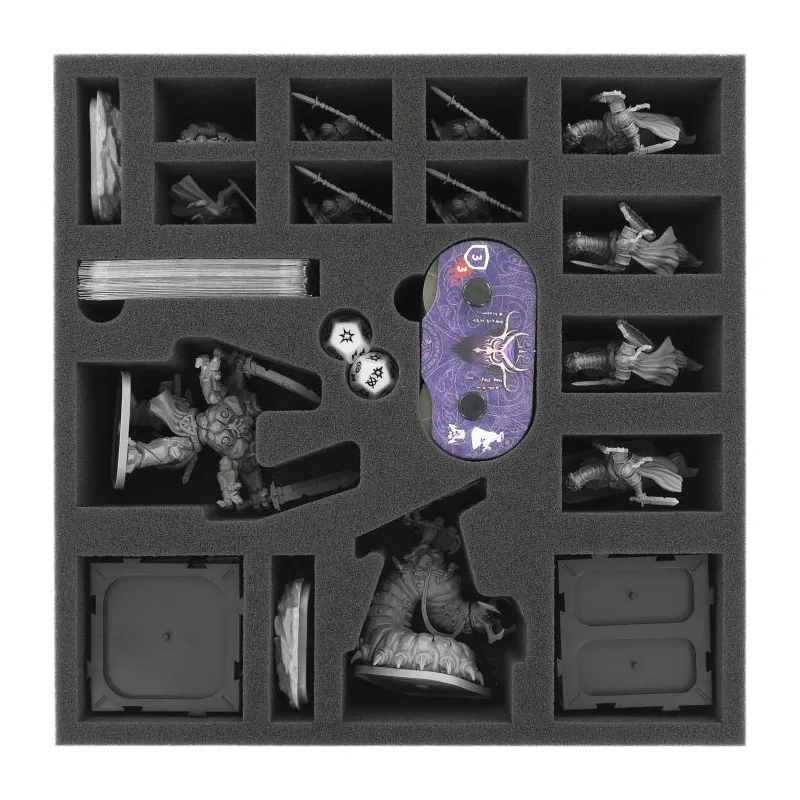 Speziell für die Runewars – Miniaturenspiel Brettspielbox geschnittene Einlage. Die Schaumstoffeinlage eignet sich besonders gut für große Miniaturen und Bases.