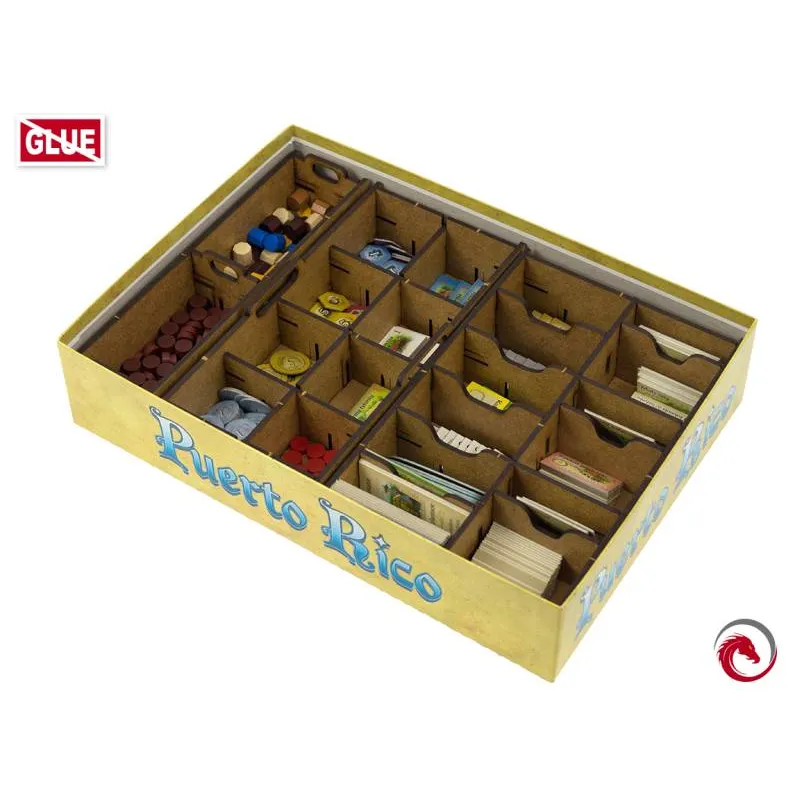 Dieser Schachteleinsatz ist speziell für das Spiel Puerto Rico konzipiert und bietet ausreichend Stauraum für die verschiedenen Spielmaterialien wie Marker, Karten, Würfel, Figuren und vieles mehr. Auch die Spielanleitung und diverse Spielplanteile finden bequem Platz in der Schachtel. Durch die Box sind die Spielmaterialien während des Spiels immer gut sortiert und griffbereit. Selbst wenn die Schachtel geschlossen und verstaut wird, werden die Materialien somit ordentlich in der Schachtel gelagert. Dadurch kann bei einem erneuten Spiel sofort durchstarten werden ohne das nervige sortieren von Spielmaterialien. Der Einsatz ist langlebig und aus hochwertigem HDF gefertigt. Um es zu montieren, ist kein Klebstoff erforderlich. Der Schachteleinsatz wird somit einfach in die Schachtel des Spiel eingelegt.