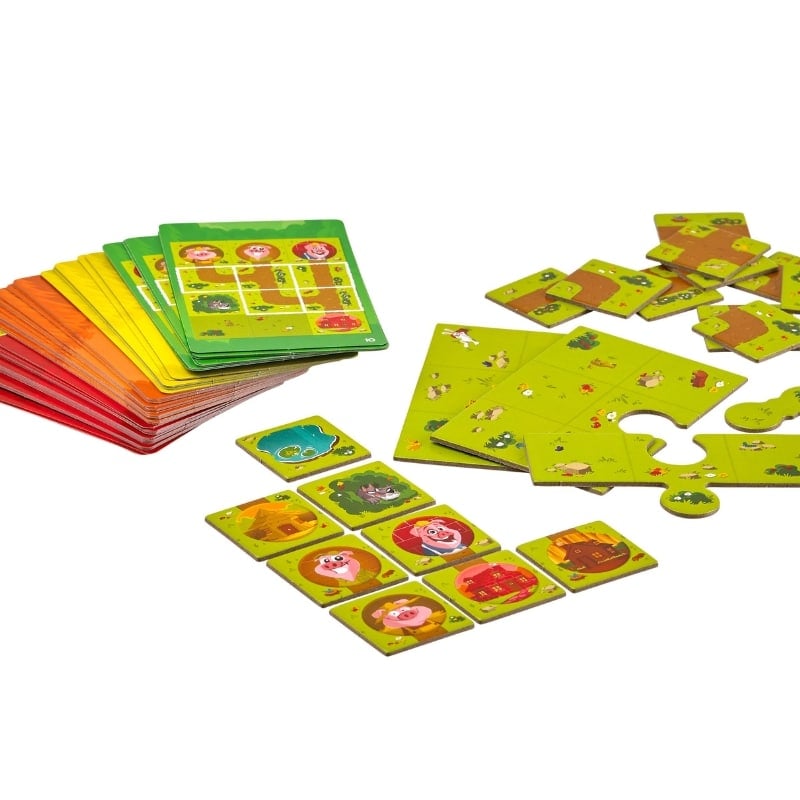 Der Sturm kommt! Hilf den Schweinen, nach Hause zu kommen. Aber Vorsicht vor dem Wolf und dem See, die die Aufgabe erschweren! Wählen Sie eine Herausforderungskarte, schnappen Sie sich die richtigen Teile und erstellen Sie die richtigen Routen für die Schweine, um nach Hause zu kommen!