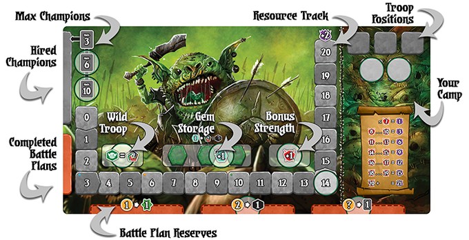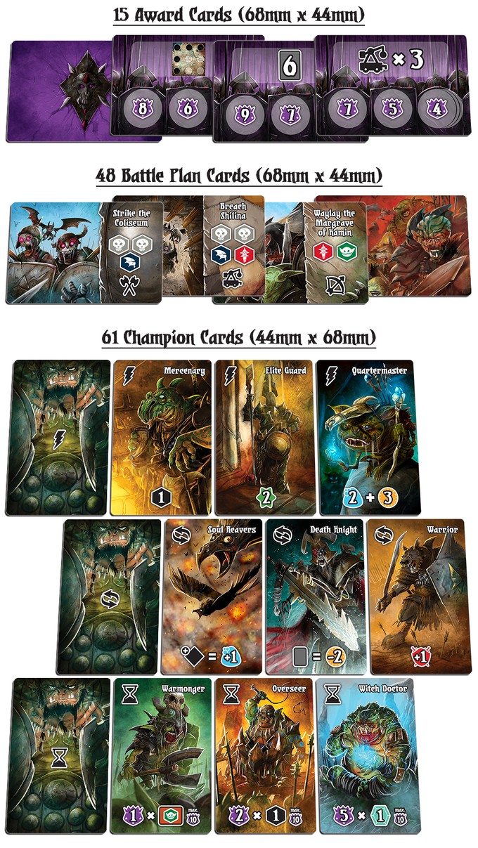 – Action Selection. Move your Warden token to any of the five Shadow Shrines to take a specific action – Drafting Battle Plans, Harvesting Power Gems, Gaining Gold, Hiring Champions with Special Powers, and Launching Battles.
