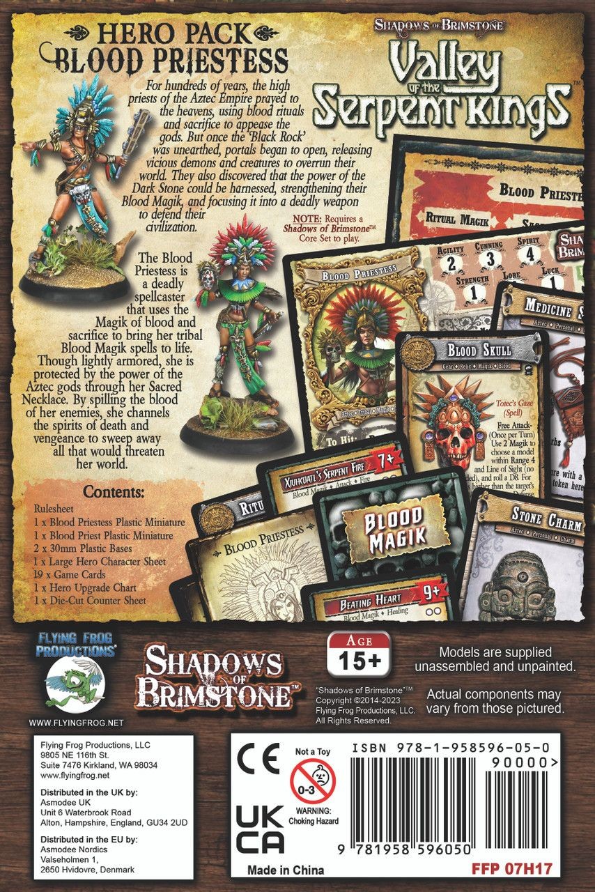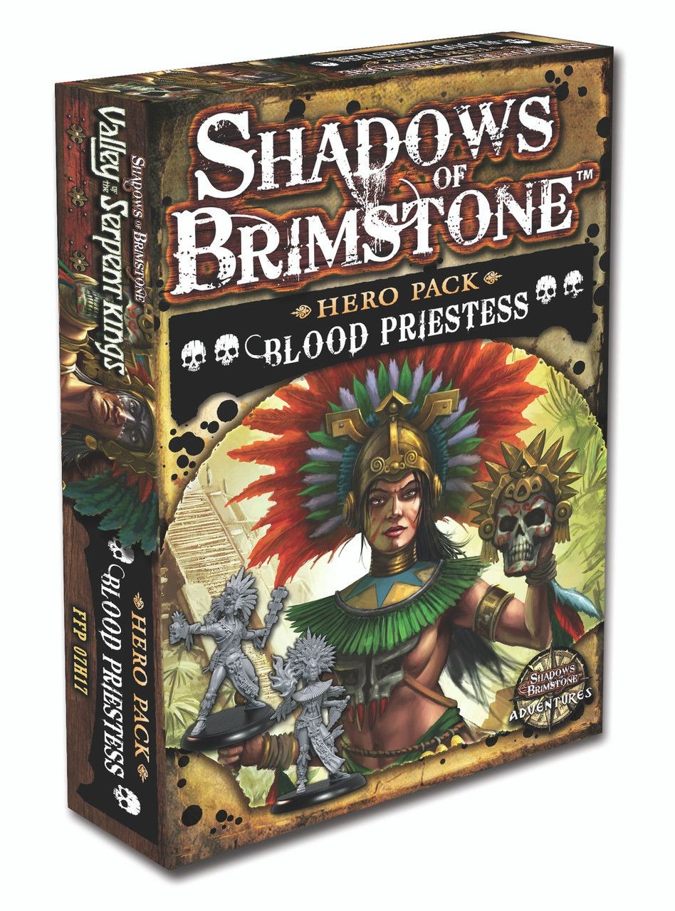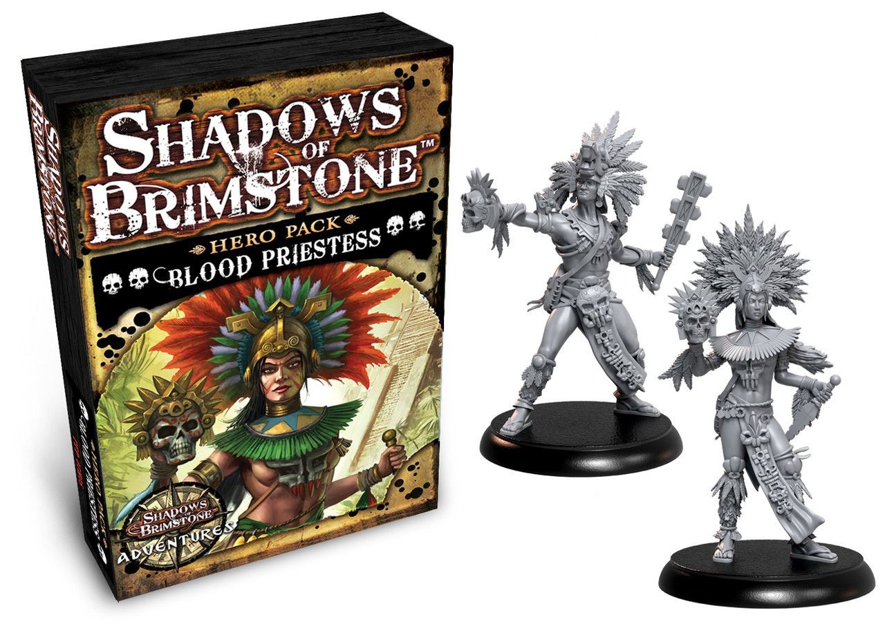 This new Aztec-themed Hero Pack contains all of the cards, Hero Character Sheet, Upgrade Chart, and rules needed to play a Blood Priestess Heroin your games of Shadows of Brimstone, including 2 high detail plastic models to represent the Male and Female versions of the Hero Class. Combined with the Jaguar Warrior Hero Class, this gives players the option of running an Aztec-themed Hero Party, or joining the Conquistadors in the war against the Serpentmen.