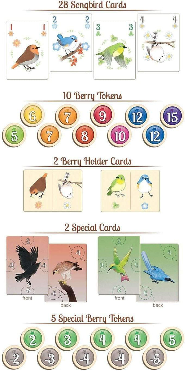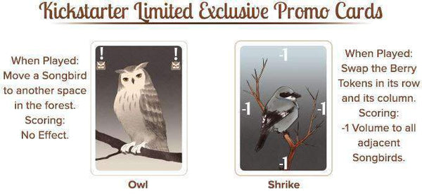 Content Notes:Kickstarter Edition of Songbirds card game by Daily Magic Games. Includes Core Game, Owl and Shrike promo cards, and all unlocked stretch goals. Please note: unless otherwise stated paid add ons from the Kickstarter Campaign are not included.