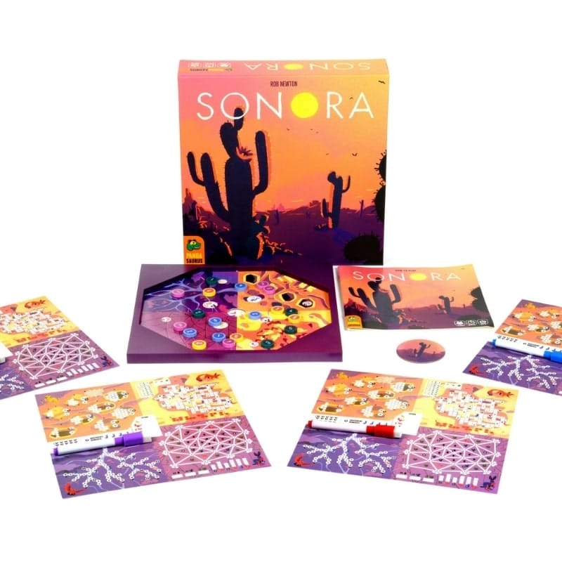 In Sonora tippen die Spieler Holzsteine auf ein Spielbrett, das verschiedene lebendige Landschaften im Sonora-Sand darstellt. In jedem Bereich gibt es ein anderes, einzigartiges Spiel. Daher ist ein geschicktes Zielen erforderlich, um in dem vom Spieler gewählten Bereich zu spielen und Punkte auf Ihrem trocken abwischbaren Blatt zu erzielen! Aber hüten Sie sich vor anderen Spielern, die gerne Steine anstoßen, um Punkte zu sammeln.
