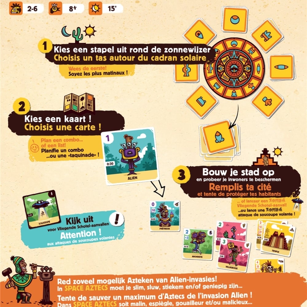 Es gibt verschiedene Kartenfamilien, jede mit ihrer eigenen Art, Punkte zu erzielen oder einen bestimmten Effekt zu haben, wie zum Beispiel den Einsatz einer fliegenden Untertasse. Das Spiel endet, wenn eine bestimmte Anzahl an Kartenstapeln rund um die Sonnenuhr leer ist oder eine bestimmte Anzahl an Angriffen mit fliegenden Untertassen gespielt wurde.