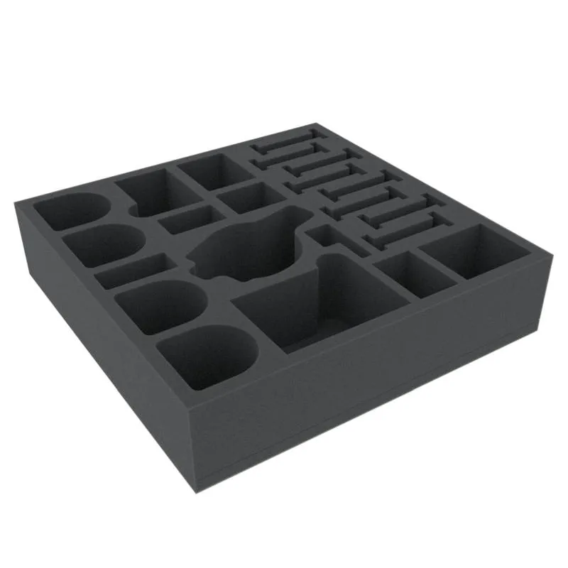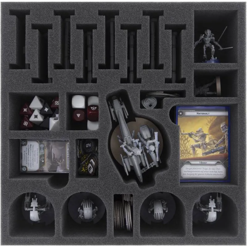 Das Ende der Galaktischen Republik scheint gekommen. Die Übermacht der Separatisten, mit ihrer riesigen Kampfdroidenarmee, droht die Republik auszulöschen. Bleibt nur noch eine Hoffnung: die Klontruppen, einer von edelmutigen Jedi-Rittern geführten Armee aus Elitesoldaten. Mach dich bereit für epische Schlachten und legendäre Kämpfe. Um dich dabei zu unterstützen, gibt es das maßgeschneiderte Schaumstoffset, das für Schutz und Ordnung in deiner Brettspiel Box sorgt. In der oberen Einlage kannst du 32 Miniaturen unterbringen. Die Klontruppler der Galaktischen Republik bekommen, genauso wie die Kampfdroiden der Separatisten, eigene passgenaue Fächer zugeteilt. So bleiben die feinteiligen Miniaturen auch beim Transport sicher an ihrem Platz. Empfindliche Teile sind dadurch bestens vor Beschädigung geschützt. Die Farben bemalter Miniaturen bleiben ebenfalls verschont von Kratzern und Abrieb. Die vier Fächer in der Mitte können zum Sortieren der Marker genutzt werden. Die zweiten Einlage kümmert sich um die restlichen Miniaturen und das Spielmaterial. Ein großes, individuell zugeschnittenes Fach beherbergt den Barc-Gleiter. Vier Fächer sind für die Droidekas vorgesehen und zwei Fächer für Obi-Wan Kenobi und seinen Gegenspieler General Grievous. Auch für die Barrikaden gibt es maßgeschneiderte Fächer. Für die Spielkarten gibt es zwei Fächer, ein großes und ein kleines. Die Fächer sind mit fingerbreiten Aussparungen versehen, um dir das Herausnehmen der Stapel zu erleichtern. Alle Karten passen auch mit Kartenhüllen. Verbleiben noch fünf Fächer zum Ordnen von Markern, Würfeln und dem Rundenzähler. Ein passender Schaumstoffdeckel (4 mm) schließt die Rundumversorgung ab. Auf der Abdeckung kannst du die Bewegungshilfen, den Maßstab und das Regelbuch ablegen. Die Schaumstoffeinlage ragt ein wenig über den Rand der Box hinaus (ca. 1 – 2 cm). Eine Schaumstoffeinlage hat die Abmessungen: 285 x 285 x 40 mm Gesamthöhe (30 mm Nutzhöhe und 10 mm Boden). Eine Schaumstoffeinlage hat die Abmessungen: 285 x 285 x 65 mm Gesamthöhe (55 mm Nutzhöhe und 10 mm Boden). – Abmessung der ganzen Schaumstoffeinlage: 285 x 285 x 109 mm – hochwertiger, feinporiger Schaumstoff – FCKW-, chlor- und säurefrei – Made in Germany