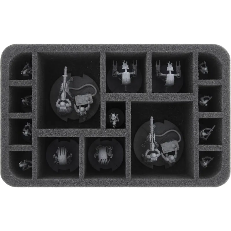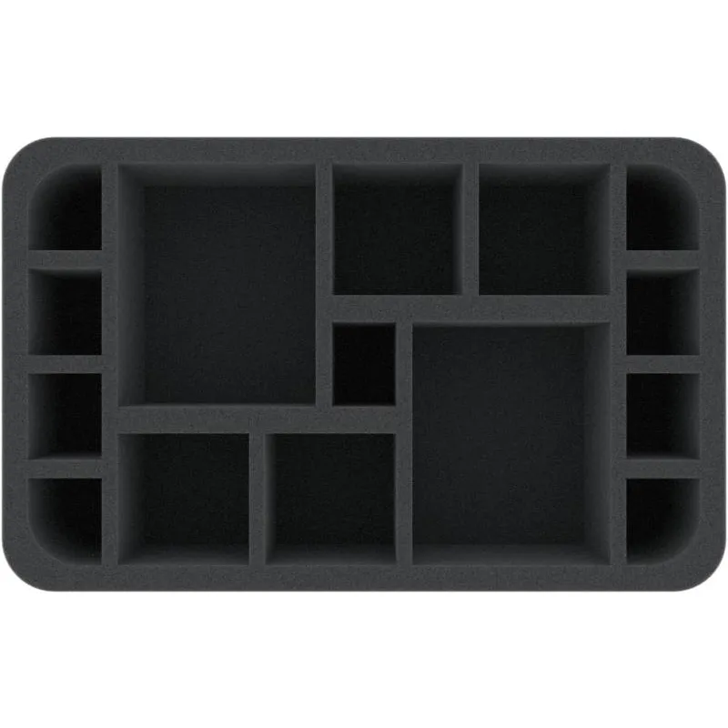Mit dieser Schaumstoffeinlage bekommt man bis zu 15 Star Wars – Legion Miniaturen einen sicheren Unterschlupf. Die Einlage bietet 8 Fächer für Standard Infanterie (z. B. Kampfdroiden, Truppler), 4 Fächer für mittelgroße Miniaturen (z. B. Droidekas), 2 Fächer für große Figuren und eines in der Mitte für Zubehör, wie Würfel und Token. Die separate Aufbewahrung der Figuren stellt sicher, dass filigrane Details, wie Schwerter und Antennen, von Beschädigungen verschont bleiben. Außerdem verhindert es ein Umherrutschen und Aneinanderstoßen der Figuren während des Transports. So sind auch in stundenlanger Feinarbeit bemalte Miniaturen sicher vor Abrieb und ärgerlichen Kratzern. 1 Fach: 32 x 25 mm 2 Fächer: 92 x 75 mm 4 Fächer: 50 x 50 mm 8 Fächer: 33 x 28 mm Die Schaumstoffeinlage hat die Abmessungen: 275 x 172 x 65 mm Gesamthöhe (55 mm Nutzhöhe und 10 mm Boden). – Abmessung der ganzen Schaumstoffeinlage: 275 x 172 x 65 mm – hochwertiger, feinporiger Schaumstoff – FCKW-, chlor- und säurefrei – Made in Germany