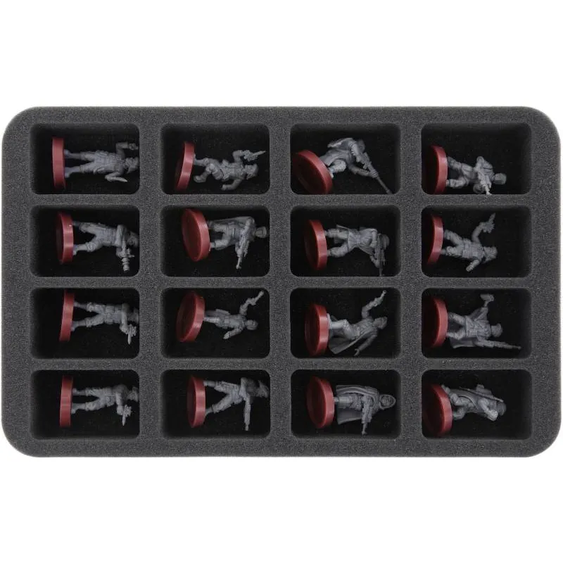 Mit diesem Half-Size Einlage bekommst du einen sicheren Unterschlupf für bis zu 16 Star Wars – Legion Miniaturen. Die Fächer eignen sich für die meisten Truppler-, Commander- oder Spezialisten Modelle. Ob Imperium oder Rebellen, jede Figur bekommt ein eigenes Fach und ist so, von Schaumstoff umgeben, sicher vor Beschädigungen. Die separate Aufbewahrung der Figuren stellt sicher, dass Flammenwerfer oder Lichtschwert auch weiterhin einsatzbereit bleiben. Außerdem verhindert es ein Umherrutschen und Aneinanderstoßen der Figuren während des Transports. So sind auch in stundenlanger Bemalung eingefärbte Miniaturen sicher vor Abrieb und ärgerlichen Kratzern. 16 Fächer: 54 x 35 mm Die Schaumstoffeinlage hat die Abmessungen: 275 x 172 x 40 mm Gesamthöhe (30 mm Nutzhöhe und 10 mm Boden). – Abmessung der ganzen Schaumstoffeinlage: 275 x 172 x 40 mm – hochwertiger, feinporiger Schaumstoff – FCKW-, chlor- und säurefrei – Made in Germany