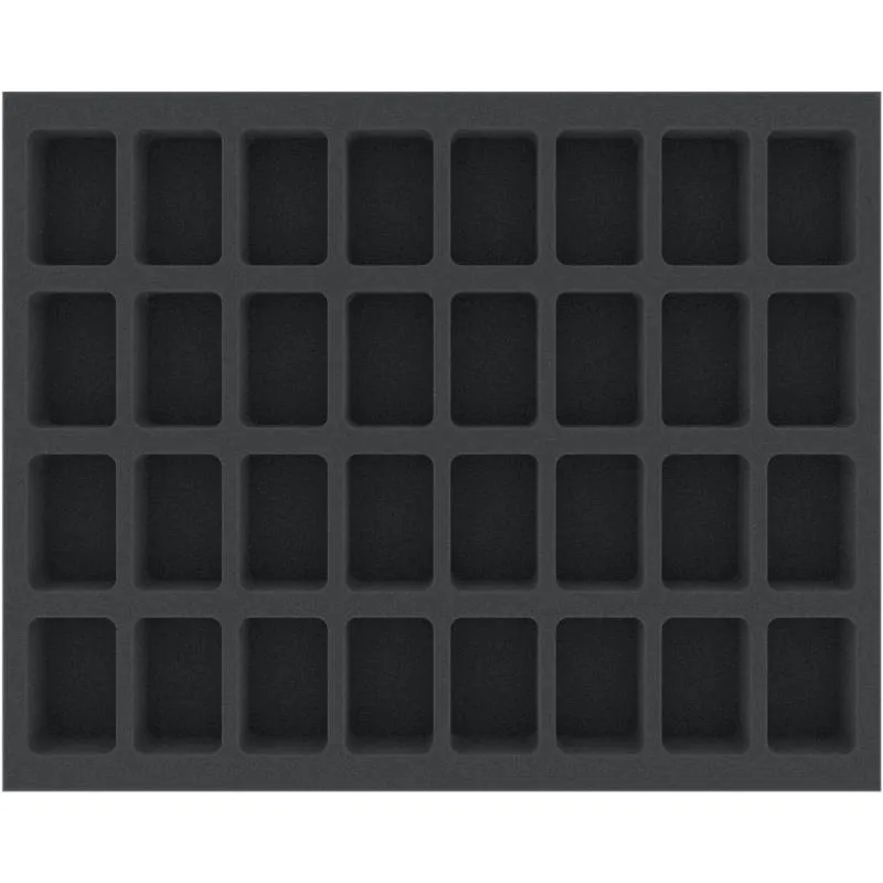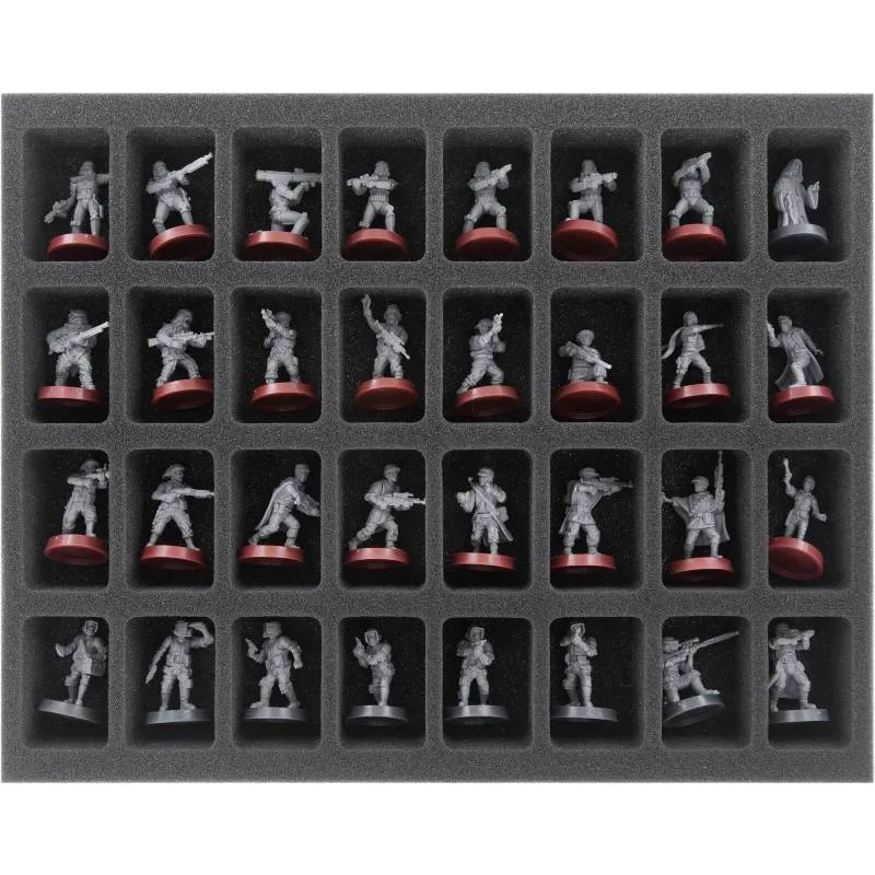 Mit diesem Full-Size Einlage bekommst du einen sicheren Unterschlupf für bis zu 32 Star Wars – Legion Miniaturen. Die Fächer eignen sich für die meisten Truppler-, Commander- oder Spezialisten Modelle. Ob Imperium oder Rebellen, jede Figur bekommt ein eigenes Fach und ist so, von Schaumstoff umgeben, sicher vor Beschädigungen. Die separate Aufbewahrung der Figuren stellt sicher, dass Flammenwerfer oder Lichtschwert auch weiterhin einsatzbereit bleiben. Außerdem verhindert es ein Umherrutschen und Aneinanderstoßen der Figuren während des Transports. So sind auch in stundenlanger Bemalung eingefärbte Miniaturen sicher vor Abrieb und ärgerlichen Kratzern. 32 Fächer: 54 x 35 mm Die Schaumstoffeinlage hat die Abmessungen: 345 x 275 x 40 mm Gesamthöhe (30 mm Nutzhöhe und 10 mm Boden). – Abmessung der ganzen Schaumstoffeinlage: 345 x 275 x 40 mm – hochwertiger, feinporiger Schaumstoff – FCKW-, chlor- und säurefrei – Made in Germany