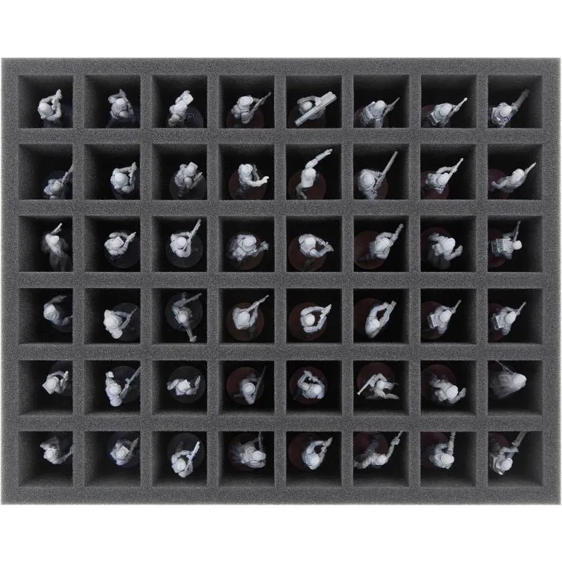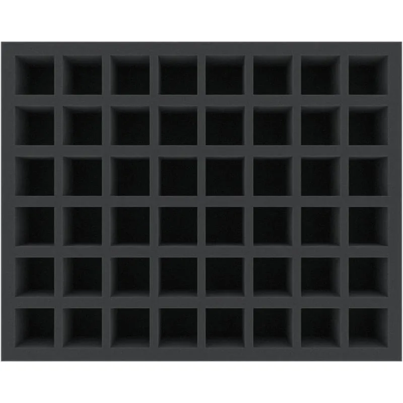 Mit diesem Full-Size Einlage bekommst du einen sicheren Unterschlupf für bis zu 48 Star Wars – Legion Miniaturen. Die Fächer eignen sich für die meisten Truppler-, Commander- oder Spezialisten Modelle. Ob Imperium oder Rebellen, jede Figur bekommt ein eigenes Fach und ist so, von Schaumstoff umgeben, sicher vor Beschädigungen. Die separate Aufbewahrung der Figuren stellt sicher, dass Flammenwerfer oder Lichtschwert auch weiterhin einsatzbereit bleiben. Außerdem verhindert es ein Umherrutschen und Aneinanderstoßen der Figuren während des Transports. So sind auch in stundenlanger Bemalung eingefärbte Miniaturen sicher vor Abrieb und ärgerlichen Kratzern. 48 Fächer: 34 x 34 mm Die Schaumstoffeinlage hat die Abmessungen: 345 x 275 x 55 mm Gesamthöhe (45 mm Nutzhöhe und 10 mm Boden). – Abmessung der ganzen Schaumstoffeinlage: 345 x 275 x 55 mm – hochwertiger, feinporiger Schaumstoff – FCKW-, chlor- und säurefrei – Made in Germany