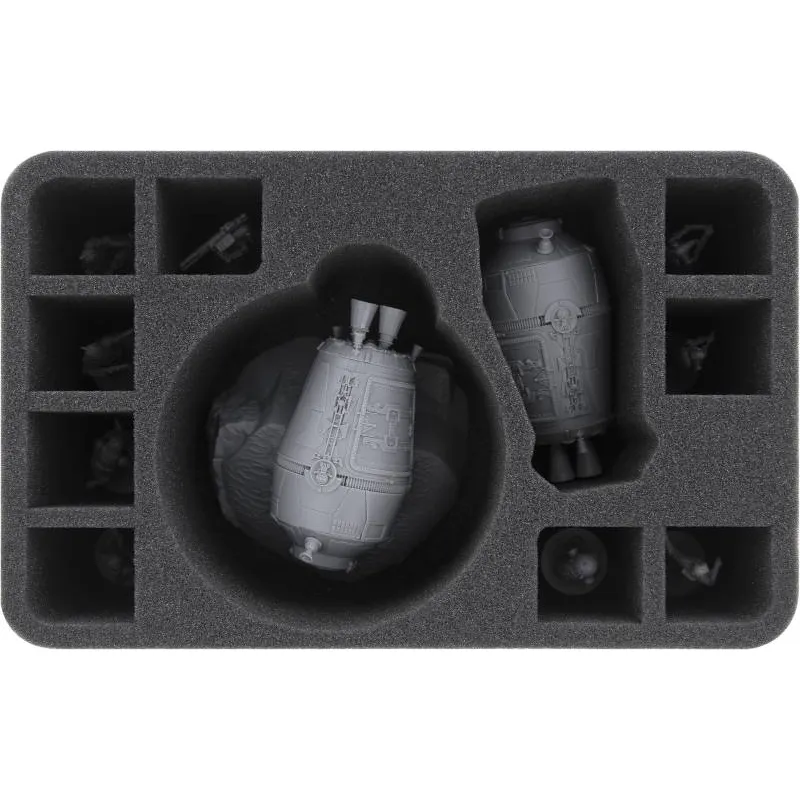 Mit einer abgestürzten Rettungskapsel und zwei Droiden auf dem Planeten Tatooine ging damals alles los. Dank der Schlachtfeld Erweiterung kannst du jetzt ihre verzweifelte Mission nachspielen. Diese Schaumstoffeinlage für die Star Wars – Legion Abgestürzte Rettungskapsel kümmert sich darum, dass die Miniaturen mindestens genauso lange überdauern wie Episode IV. Zum Aufbewahren der Rettungskapsel habt ihr zwei Optionen zur Verfügung. Ein Fach bietet Platz für die zusammengesetzte Kapsel. Du kannst sie aber auch getrennt voneinander aufbewahren. Das Fach daneben ist maßgeschneidert für die Kapsel ohne den Boden. Beide Fächer sind miniaturengenau zugeschnitten. Das sorgt dafür, dass die Modelle während des Transports nicht umherrutschen. Der weiche Schaumstoff schützt die Kanten und empfindliche Teile vor Beschädigungen. Auch das bemalte Modell ist hier sicher vor Kratzern und Abrieb und kommt so unversehrt am Spieltisch an. Natürlich finden auch C-3PO und R2-D2 auf dieser Einlage ein gemütliches Plätzchen. Zwei von den insgesamt 9 kleinen Fächern sind für die beiden Droiden reserviert. Die anderen können mit Miniaturen deiner Wahl besetzt werden. 9 Fächer: 36 x 33 mm Die Schaumstoffeinlage hat die Abmessungen: 275 x 172 x 85 mm Gesamthöhe (75 mm Nutzhöhe und 10 mm Boden). – Abmessung der ganzen Schaumstoffeinlage: 275 x 172 x 85 mm – hochwertiger, feinporiger Schaumstoff – FCKW-, chlor- und säurefrei – Made in Germany