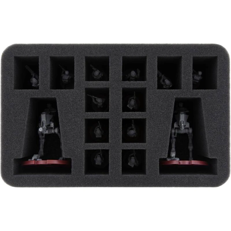 Schaumstoffeinlage für zwei AT-RT und 12 Rebellen. Die speziell geformten AT-RT Fächer ermöglichen den sicheren Transport der Fahrzeuge. Weitere 12 Fächer für Truppen runden die Einlage ab. 4 Fächer: 40 x 30 mm 8 Fächer: 30 x 30 mm Die Schaumstoffeinlage hat die Abmessungen: 275 x 172 x 80 mm Gesamthöhe (70 mm Nutzhöhe und 10 mm Boden). – Abmessung der ganzen Schaumstoffeinlage: 275 x 172 x 80 mm – hochwertiger, feinporiger Schaumstoff – FCKW-, chlor- und säurefrei – Made in Germany