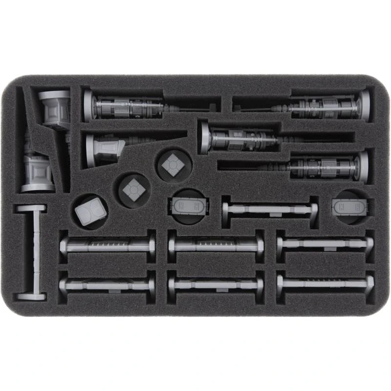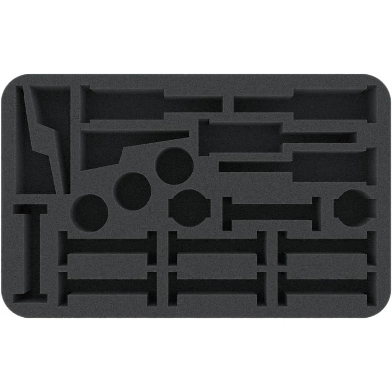Mit dieser Schaumstoffeinlage lassen sich alle 12 Miniaturen für Objekte auf dem Schlachtfeld sicher und ordentlich aufbewahren. In den 12 maßgefertigten Fächern sind die Antennen der Feuchtigkeitsvaporatoren bestens vor dem Abknicken geschützt. Auch wird ein Umherrutschen der Miniaturen verhindert, damit bemalte Geländeobjekte von Kratzern und abgeplatzten Farben verschont bleiben. Weitere 8 Fächer sind zugeschnitten auf die Figuren aus dem Barrikaden Set. So sind die Barrikaden ebenfalls immer griffbereit verstaut. Die Schaumstoffeinlage hat die Abmessungen: 275 x 172 x 40 mm Gesamthöhe (30 mm Nutzhöhe und 10 mm Boden). – Abmessung der ganzen Schaumstoffeinlage: 275 x 172 x 40 mm – hochwertiger, feinporiger Schaumstoff – FCKW-, chlor- und säurefrei – Made in Germany