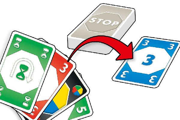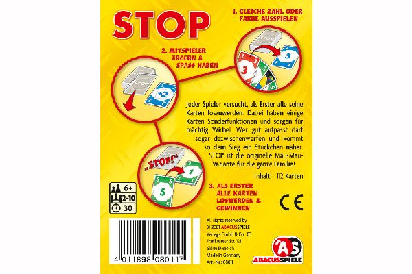 Als Erster alle Karten abwerfen! Das klingt einfach – und das ist es auch! Man legt entweder die selbe Zahl oder die selbe Farbe wie die oberste Karte auf dem Stapel, und schon ist man wieder eine Karte los. Das Besondere bei STOP ist, dass man ständig aufpassen muss! Denn Dazwischendrängeln ist erlaubt, wenn man die gleiche Karte besitzt, wie die, die ein Mitspieler gerade ausgespielt hat. Und wenn man den anderen Spielern mit einem schnellen Dreh eine 6 für eine 9 vormacht, rückt der Sieg immer näher.
