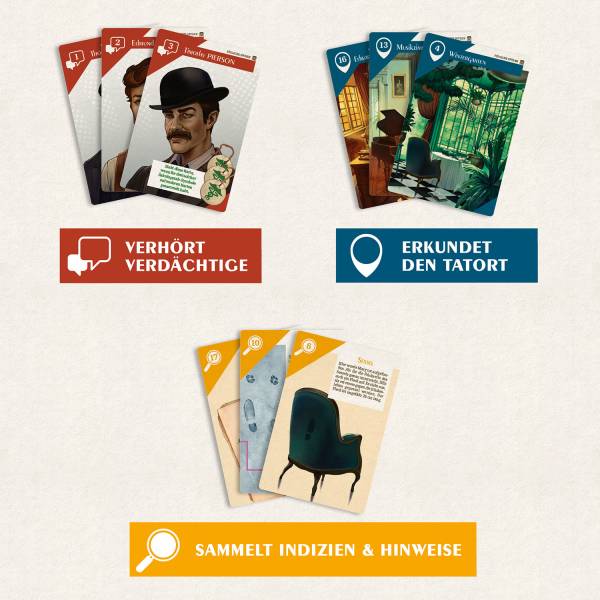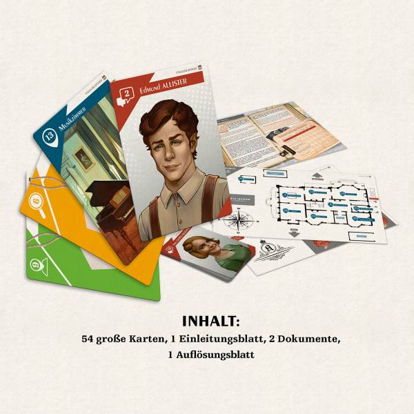 Was ist in der Villa Allister geschehen? Wer hat die junge Mary Higgins ermordet? Wer steckt hinter dem seltsamen Verschwinden ihres Ehemannes? Dieser Fall muss gemeinsam mit Detektivin Claire Harper in den schottischen Highlands gelöst werden. Irgendjemand muss etwas an diesem Tatort mitbekommen haben. Die 1-5 Spielerinnen und Spieler ermitteln gemeinsam, befragen Familienangehörige, Hausangestellte – sie alle sind Verdächtige. Karte für Karte kommen sie in diesem Detektivspiel den Familiengeheimnissen der Familie Allister näher. Einfache Regeln und tolles Setting für einen Spieleabend: diesen Fall lösen alle gemeinsam!