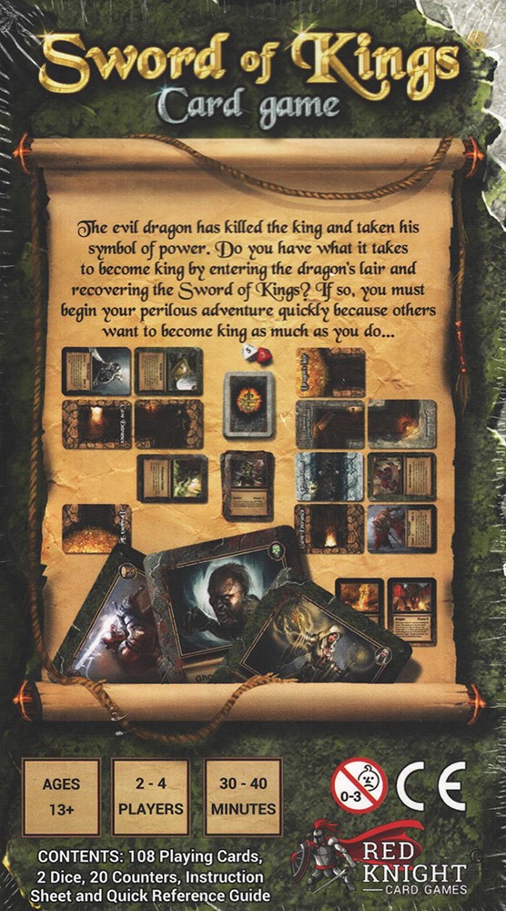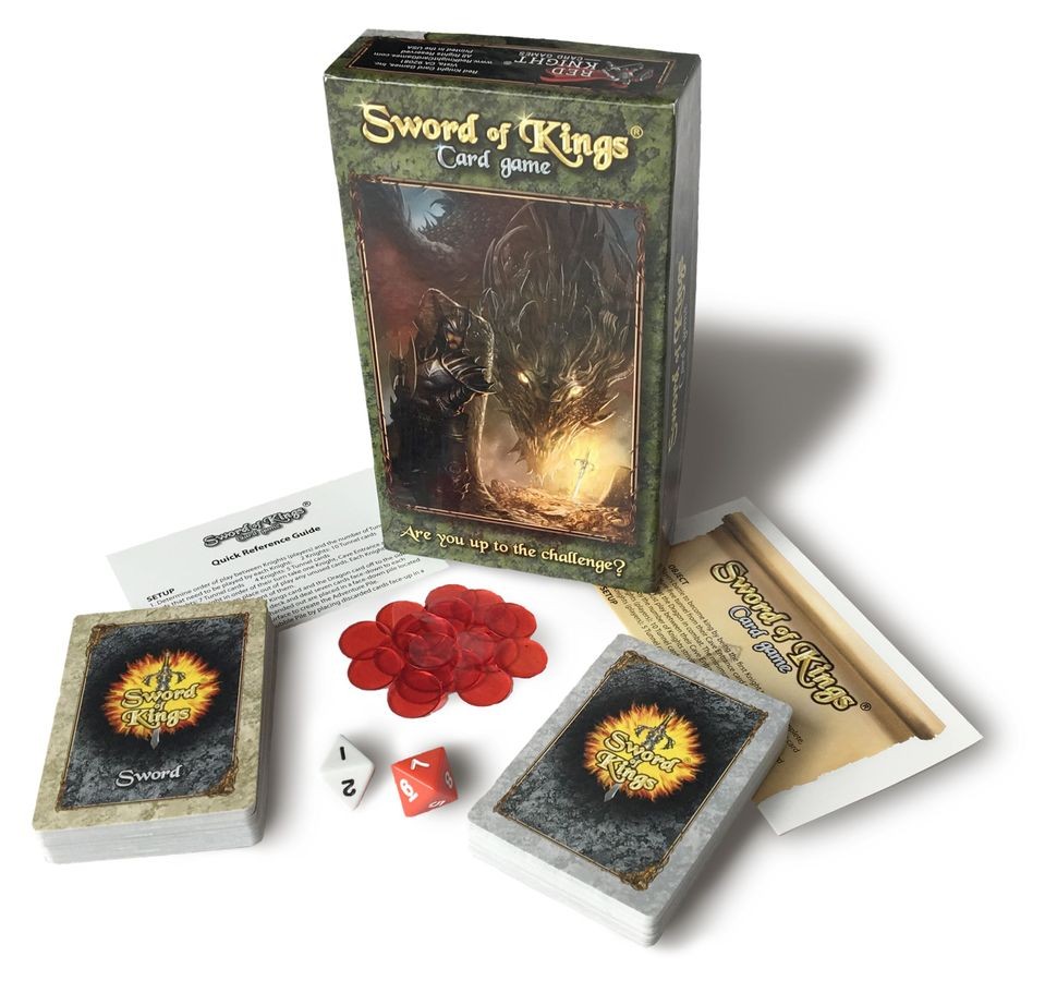 TheSword of Kingsgame consists of 108 beautifully crafted cards that are used by 2-4 players (knights). The goal for each knight is to build a unique tunnel to their dragon’s Lair. While building their tunnel, knights will discover various magical treasures and encounter friendly people to help them on their quest. At the same time, Knights will find evil creatures and various obstacles they can play on the other knights to slow their progress. Once inside the lair, knights must fight the dragon that is defending the sword. The first knight to defeat the dragon claims the Sword of Kings and wins the game. Games usually take from 30-45 minutes; but with the numerous card combinations possible, game play will vary greatly in both style and time. This allows for endless hours of fun while being drawn into this beautiful and magical world.