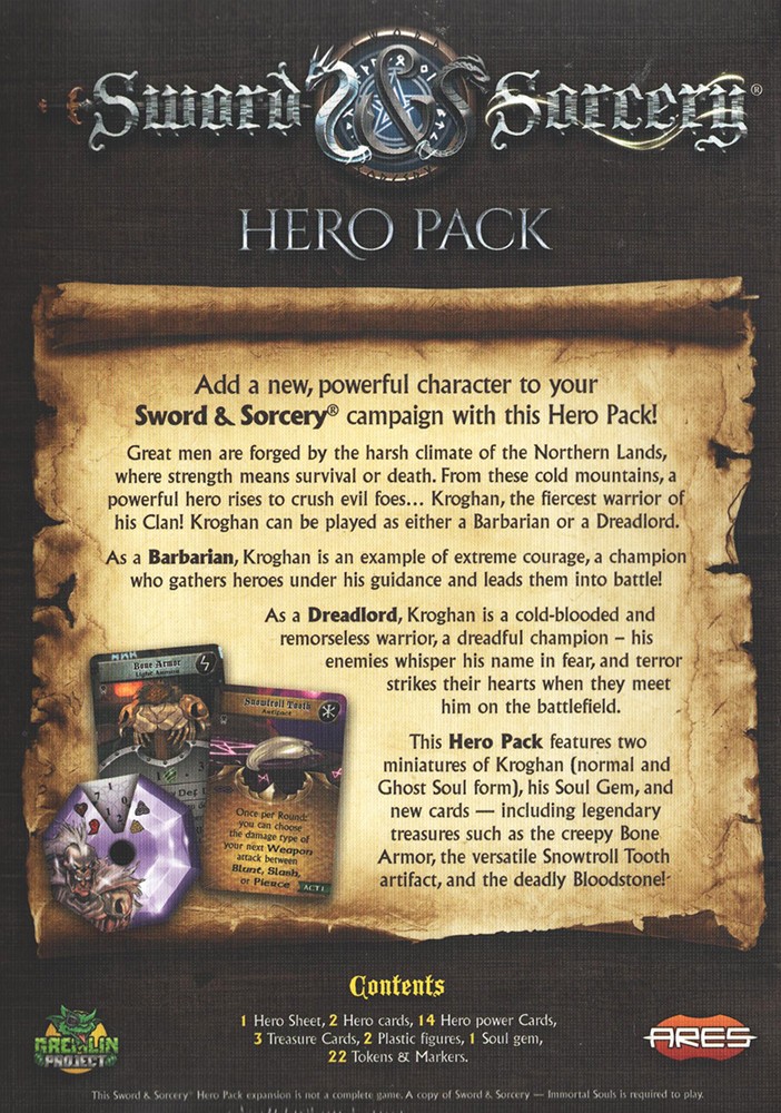 This Hero Pack features two miniatures of Kroghan (normal and Ghost Soul form), his Soul Gem, and new cards — including legendary treasures such as the creepy Bone Armor, the versatile Snowtroll Tooth artifact, and the deadly Bloodstone!