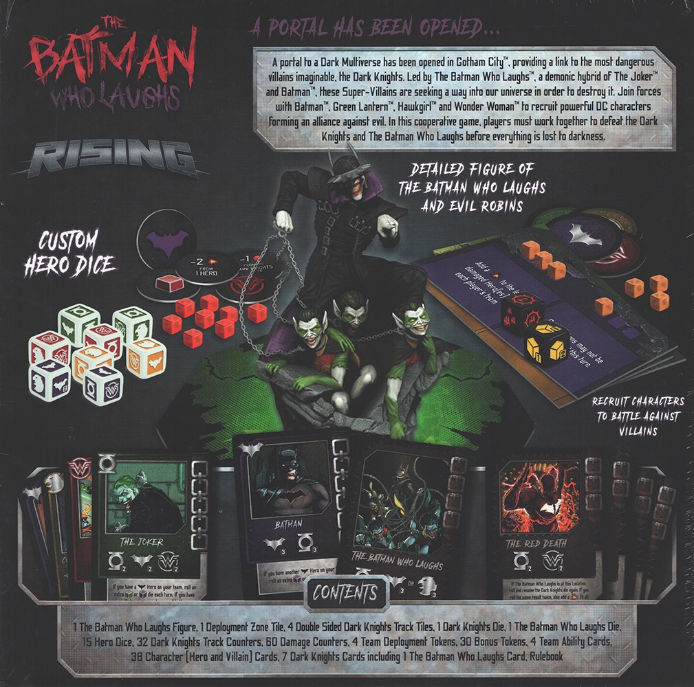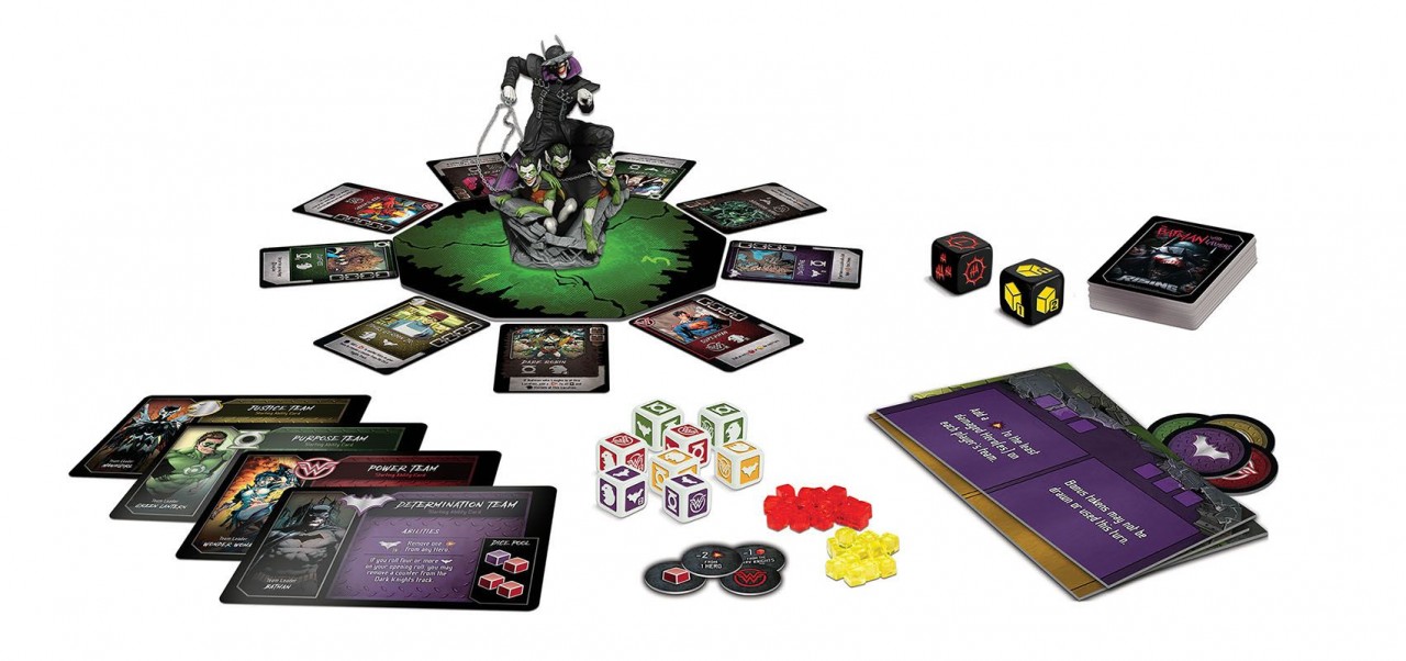 Players roll dice and work together to save the multiverse, starting with one of four starting heroes — Wonder Woman, Green Lantern, Hawkgirl, or Batman — and recruiting allies such as Harley Quinn, The Flash, and Cyborg, whose skills can complete objectives or help recover what is lost to darkness. Take out villainous versions of Batman such as The Merciless, The Dawnbreaker, The Murder Machine, and more before facing off with the psychotic Joker-ized antagonist himself, who’s represented by a custom-sculpted, full-color figure who commands a fistful of chained Evil Robins!
