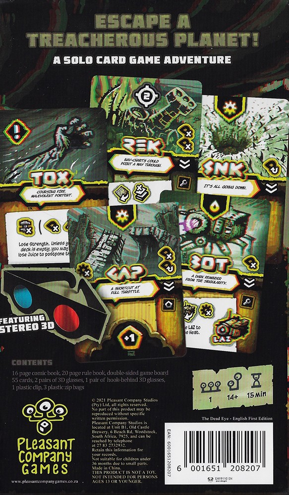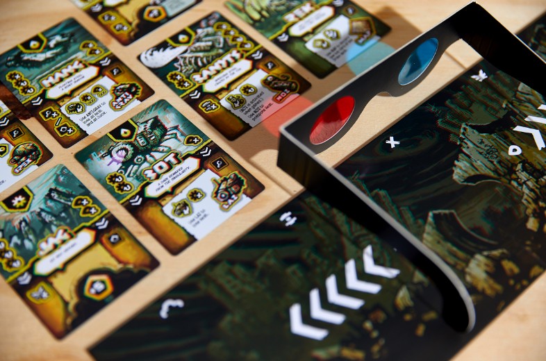 The game includes a 16-page prelude comic, 20-page rule-book, double-sided game board, 54 unique cards, two pairs of stereoscopic 3D spex and one pair of “hook-behind” 3D spex.