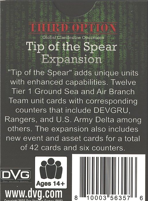„Tip of the Spear“ adds unique units with enhanced capabilities. Twelve Tier 1 Sea, Ground, and Air Branch Team unit cards with corresponding counters that include DEVGRU SEAL Team 6, and U.S. Army Delta among others. The expansion also includes new event and asset cards for a total of 42 cards and six counters.