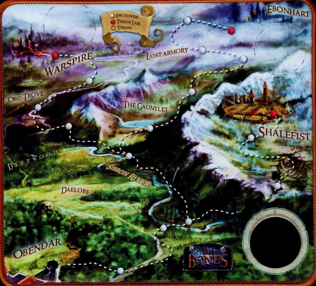 Adventure Map 2.0gives you a visual way to track your progress points in both Too Many Bones and Too Many Bones: Undertow! Using the glass bead included with your core game box, the Adventure Mat replaces your Day Counter card and removes the need to manually track your progress.