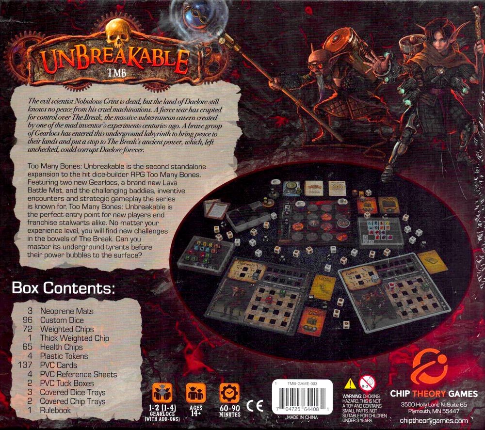 Too Many Bones: Unbreakableis the second standalone expansionto the hit dice-builder RPG Too Many Bones. Featuring two new Gearlocs, a brand new Lava Battle Mat, and and the challenging baddies, inventive encounters and strategic gameplay the series is known for, Too Many Bones: Unbreakable is the perfect entry point for new players and franchise stalwarts alike. No matter your experience level, you will find new challenges in the bowels of The Break. Can you master its underground tyrants before their power bubbles to the surface?