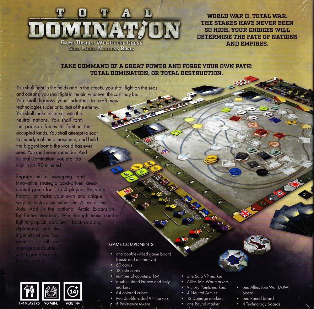 Total Dominationis a sweeping and innovative strategic card-driven area-control game for 1 to 4 players simulating World War II. Recreate history, or make your own and unique way to victory as either the Allies or the Axis. Win through tense combat, lightning-quick conquest, diplomacy with the neutral countries, and the ingenuity of your top scientists – all on a gorgeous double-sided game board.