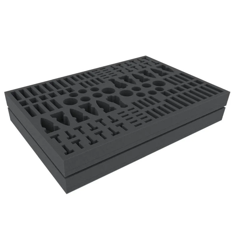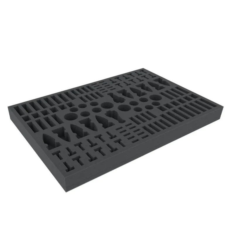 Die Revolution beendete die Herrschaft des intergalaktischen Imperiums der Lazax und ein neues Zeitalter der Freiheit begann. Nun nach 3000 Jahren, geprägt von ergebnislosen Twilight-Kriegen und Stagnation, wird es unruhig in der Galaxis und die Völker streben erneut nach Macht und Kontrolle. Ob du nun auf militärische Stärke, diplomatische Gewandtheit oder wirtschaftlichen Einfluss setzt, sind zwei Dinge von entscheidender Bedeutung: Übersicht und Organisation. Mit diesem ergänzenden Feldherr Schaumstoff-Set für die Brettspielbox bekommst du beides, und den Schutz deiner Einheiten obendrauf. Auf insgesamt drei Schaumstoffeinlagen kannst die über 350 Einheiten ordentlich verstauen. Die Einlagen legst du ganz einfach auf das originale Plastik-Inlay der Box, in dem die restlichen Spielmaterialien, wie Karten, Marker und Systemtafeln, einsortiert sind. Jede Schaumstoffeinlage kümmert sich mit 122 individuell auf die Miniaturen zugeschnittenen Fächern darum, dass jede Figur sicher verpackt ist. Auf jede Einlage passen zwei Fraktionen, übersichtlich voneinander getrennt. Von den Kriegssonnen über die Schlachtschiffe bis zur Infanterie – jede Plastikfigur ist rundum sicher in Schaumstoff gepackt. Passgenaue Fächer sorgen dafür, dass die Miniaturen auch unterwegs nicht umherrutschen oder gegeneinanderstoßen. Dadurch sind nicht nur die feinen Teile vor Beschädigungen geschützt, auch die Farben bemalter Figuren sind sicher vor Abrieb und Kratzern. Das Set enthält auch einen passenden Schaumstoffdeckel (4 mm), diesen legt man einfach auf die oberste Einlage und stellt so sicher, dass alle Spielmaterialien da bleiben wo sie hingehöhren, auch wenn die Box mal Kopf steht. Die Schaumstoffeinlage ragt sehr stark über den Rand der Box hinaus (ca. 8 – 9 cm). Die drei Schaumstoffeinlagen haben die Abmessungen: 425 x 285 x 35 mm Gesamthöhe (25 mm Nutzhöhe und 10 mm Boden) – Abmessung der ganzen Schaumstoffeinlage: 425 x 285 x 113 mm – hochwertiger, feinporiger Schaumstoff – FCKW-, Chlor- und Säurefrei – Made in Germany