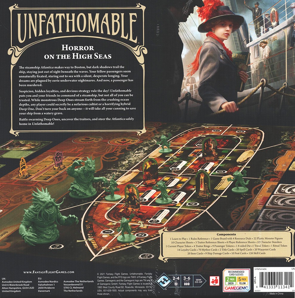 Immerse yourself among the passengers and crew of the SS Atlantica in this game of hidden loyalties, intrigue, and paranoia for three to six players. Some players are humans who are fighting for the survival of the ship, while others are traitors sent aboard the ship by mysterious beings to ensure that it never reaches port! Because player loyalties are hidden, determining who is friend and who is foe is critical to winning a thrilling game ofUnfathomable.
