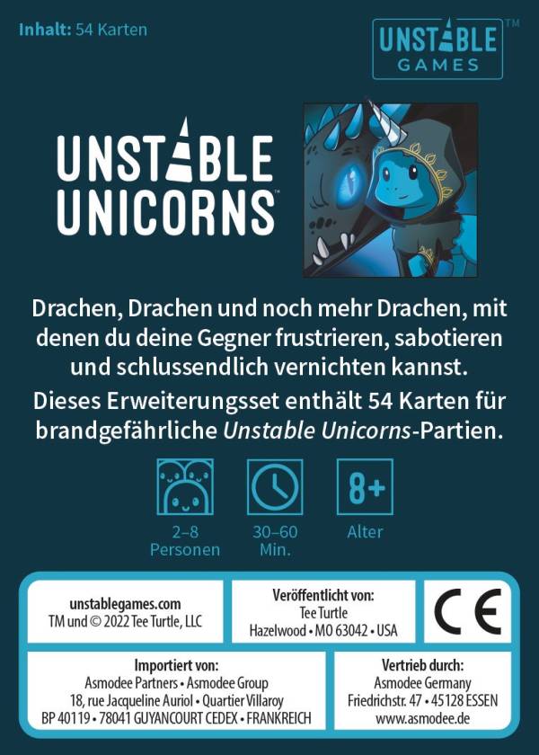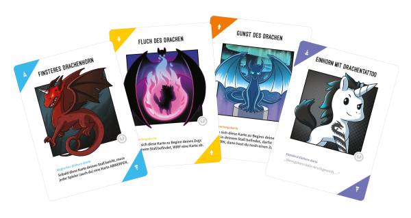 Das Drachen Erweiterungsset für Unstable Unicorns enthält 54 Karten für brandgefährliche Partien des beliebten Kartenspiels um Einhörner und Zerstörung. Die Spieler treffen auf Drachen, Drachen und noch mehr Drachen, mit denen sie ihre Gegner frustrieren, sabotieren und schlussendlich vernichten können.