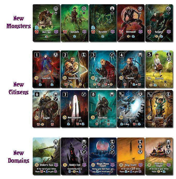 Published:2018 Content Notes:Kickstarter Exclusive Valeria: Card Kingdoms Shadowvale Board Game Expansion by Daily Magic Games. Includes Shadowvale Expansion, Relics Expansion Pack (KS Limited Exclusive), and all unlocked stretch goals. Core Game required to play (sold separately). Please note: unless otherwise stated paid add ons from the Kickstarter Campaign are not included. Darkness looms upon the Kingdom of Valeria. Werewolves, Vampires, and other shadowy creatures reach out in the night to tear apart your people. But never fear, new Citizens have joined the fray – some specializing in taking out these dark creatures! Valeria: Card Kingdoms – Shadowvalebrings in a whole new set of Citizens, Monsters, Domains, and Dukes that you can play stand-alone using components from the base game, or mix with card stacks from the base game for all new experiences.