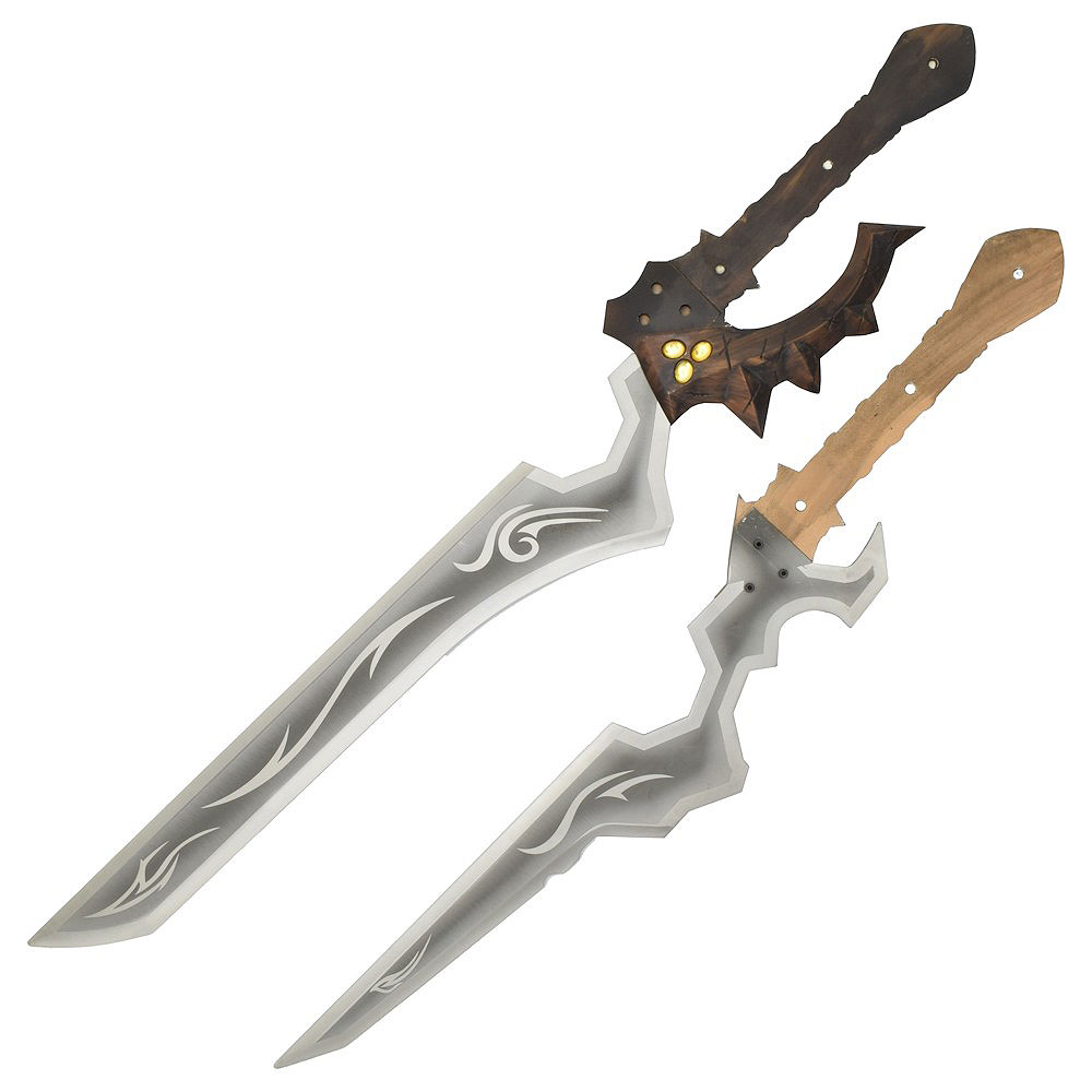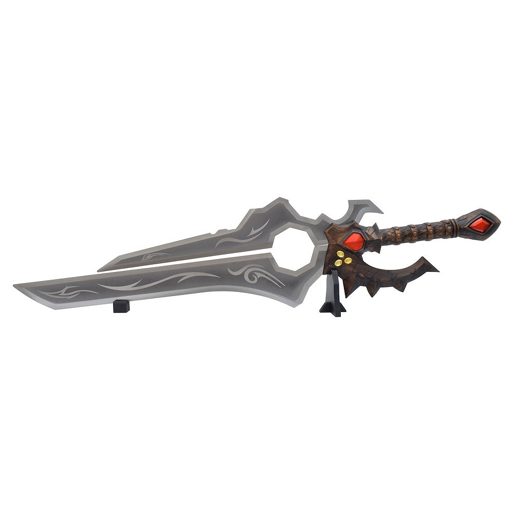Varian Wrynns Shalamayne Schwertaus dem Videospiel World of Warcraft mit Stahlklinge und Griffstück aus Harz (Resin) gefertigt inklusive Ständer. Das Schwert kann geteilt werden und besteht aus zwei verschiedenen Klingen die durch Magnete zusammen gehalten werden.