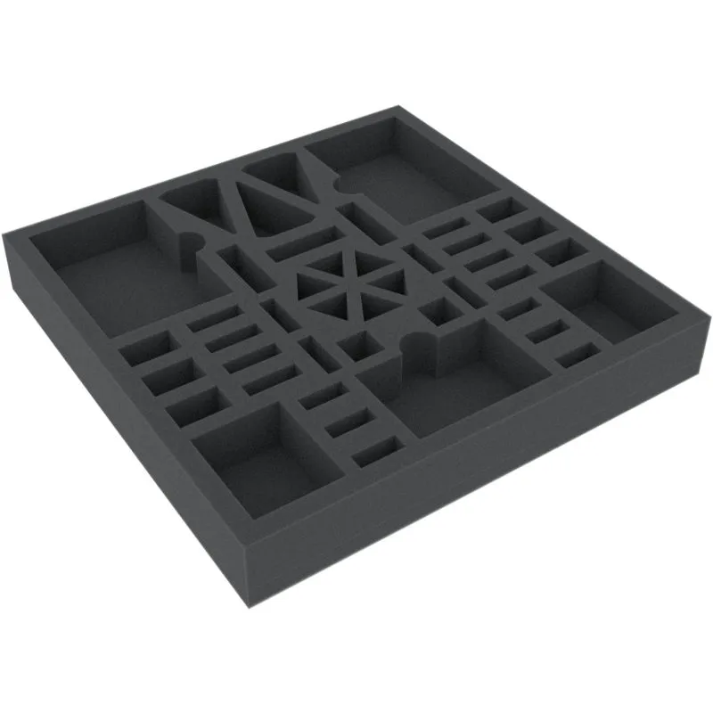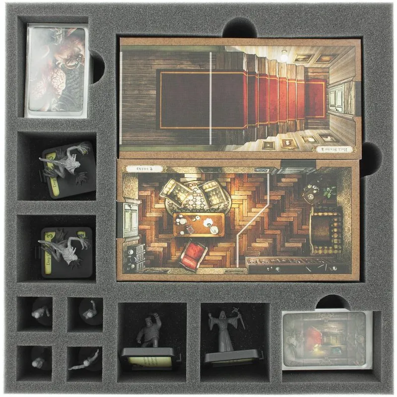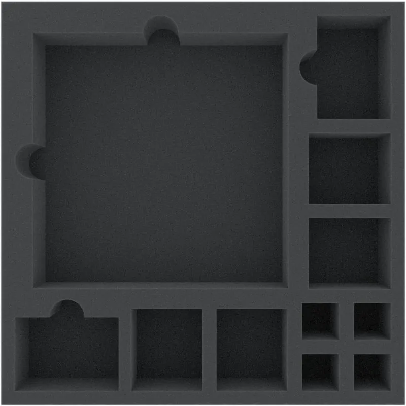 Speziell für die Villen des Wahnsinns (2. Edition) Brettspielbox geschnittene Einlage. Die 11 unterschiedlich großen Fächer eigenen sich besonders gut für die Spielplanteile der Villen des Wahnsinns Grundspielbox! Die Schaumstoffeinlage ragt dadurch sehr stark über den Rand der Box hinaus (ca. 7 cm).