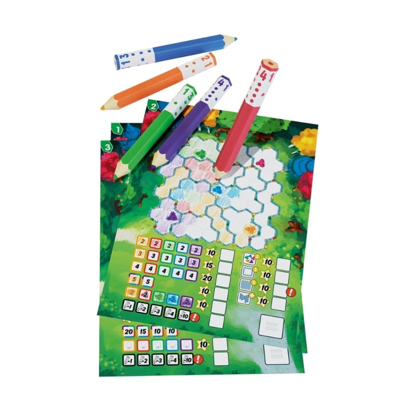 Pick-a-Pen: Gardens ist ein Spiel aus der Pick-a-Pen-Reihe des renommierten Autors Reiner Knizia und enthält Punkteblätter mit 3 aufsteigenden Levels. Auf den Wertungsblättern 2 und 3 finden Sie Blumen und Bäume, die Ihnen auf unterschiedliche Weise zu zusätzlichen Bonuspunkten verhelfen können.