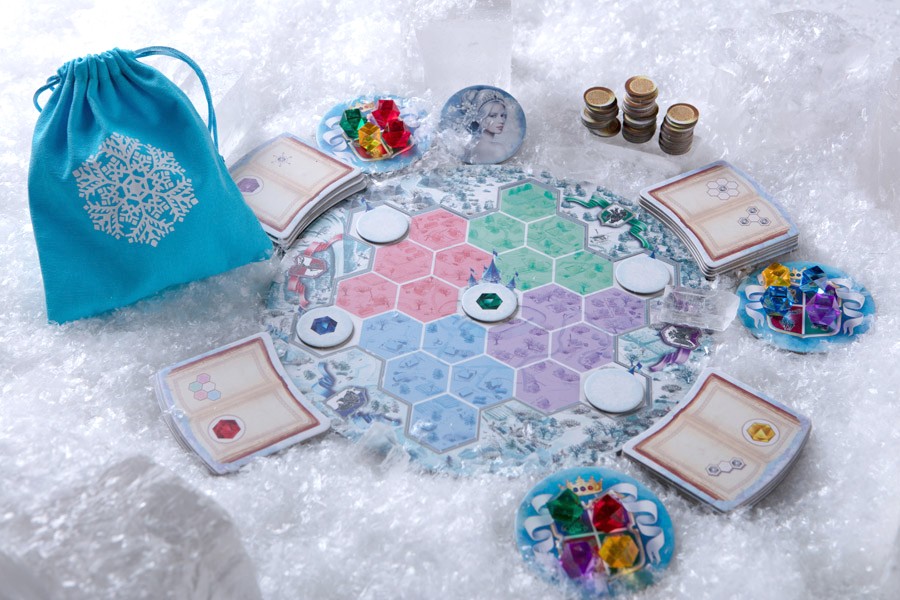 During your turn, you draft crystals and place them on the game map board known as the Queendom, thereby creating beautiful colorful patterns and gathering Spell Books. Alternatively, you may place crystals on your Spell Books to ignite their magical powers. When you are ready, you may activate your Spell Books to produce spells and gather victory points in the form of golden coins. The wizard who has the most gold by the end of the game wins the contest and becomes the Queen’s new Key Advisor.