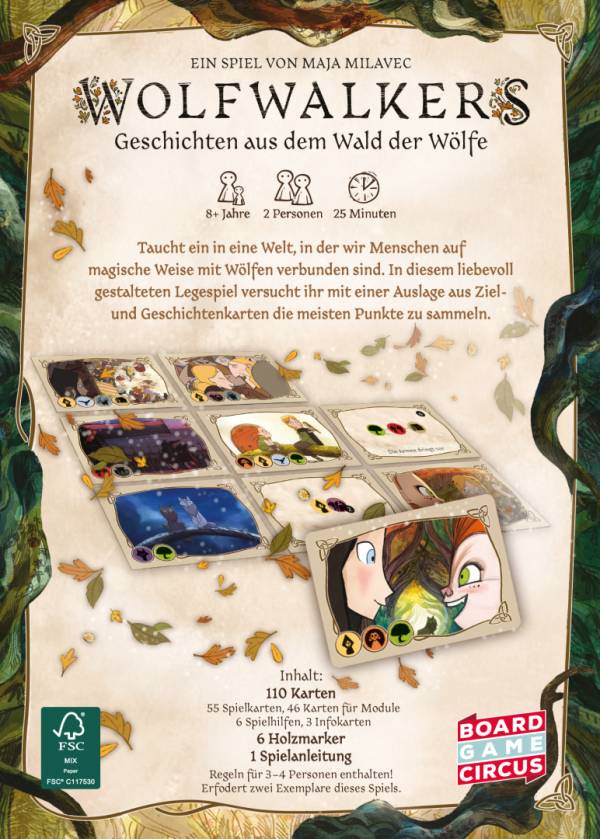 Hört ihr das? Rascheln, Heulen … Lachen. Schon eigenartig. Es heißt, im Wald wimmelt es von Wölfen. Doch ich kann spüren, dass da noch mehr ist – viel mehr. Bist du neugierig? Dann los! Geh und erlebe deine eigene Geschichte. Taucht ein in eine Welt, in der wir Menschen auf magische Weise mit Wölfen verbunden sind. In diesem liebevoll gestalteten Legespiel versucht ihr mit einer Auslage aus Ziel- und Geschichtenkarten die meisten Punkte zu sammeln.