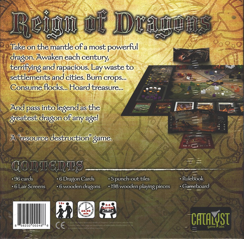In Wrath of Dragons, each player assumes the role of a dragon that, over the course of many centuries, flies into different regions of the Old World to lay waste to settlements, scorch fields, snatch livestock, take gold, and capture nobles.