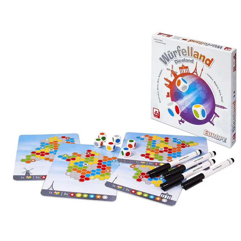 Würfelland ist ein Wettrennen und es macht großen Spaß. Nichts muss berechnet werden, es gibt keine Siegpunkte. Wer zuerst fünf Schatzfelder erreicht, hat gewonnen. Spannung und Emotionen sind garantiert. Acht abwischbare Spielfelder sorgen für jede Menge Abwechslung. Gewinnen kann so einfach sein.