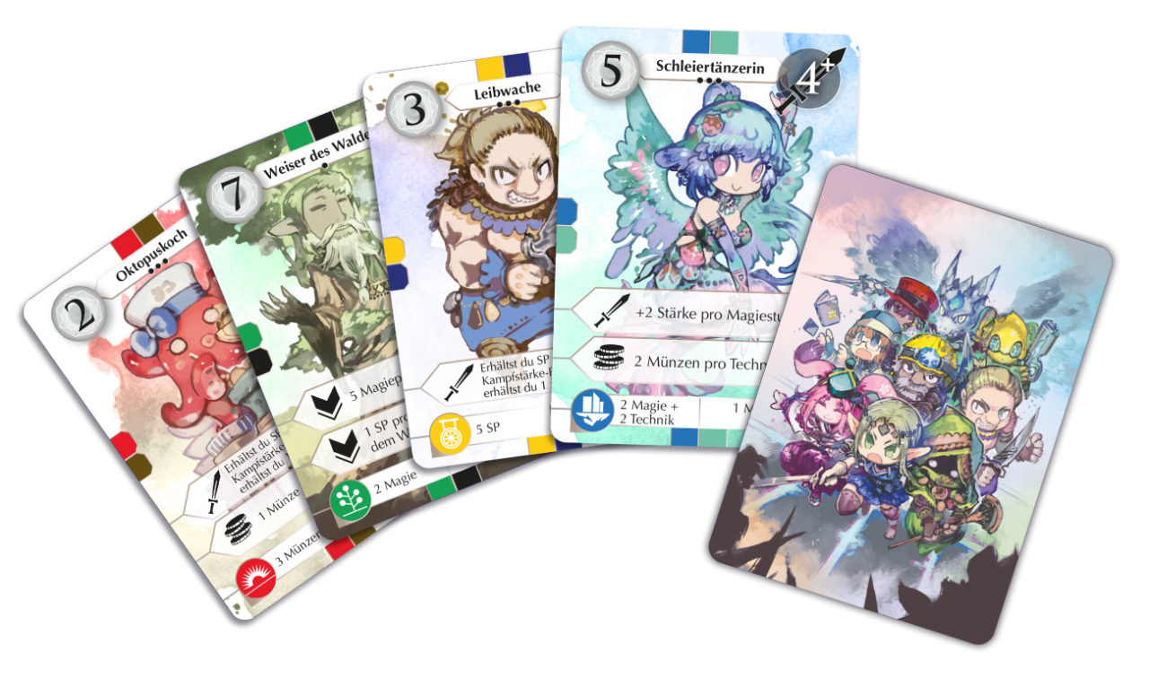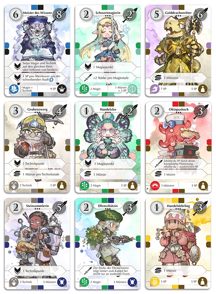 Wählt Abenteurer-Karten aus eurer Hand, bezahlt sie und legt sie in eure 3×3 große Gilden-Auslage. Holt euch damit die wichtigsten Fähigkeiten (Kampf, Technik, Magie, Einkommen) für eure Gilde und räumt durch geschicktes Platzieren noch die Boni für Kombos ab. Das richtige Timing und die Anordnung eurer Abenteurer entscheidet, ob ihr zur Gildenlegende werdet oder ob sich niemand an eure schäbige Gilde erinnern wird.