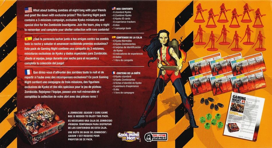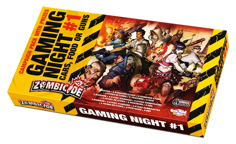 This gaming night pack contains a 3-mission campaign, exclusive Kyoko miniatures and special dice for the Zombicide boardgame. Join the team, play a night to remember and complete your shelter collection with rare contents!