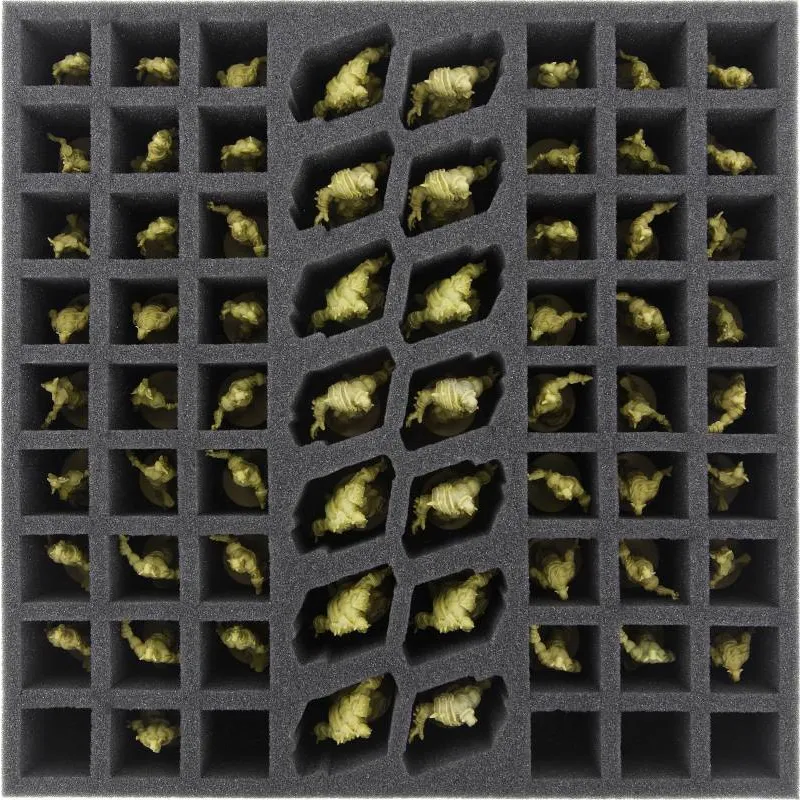 Alle deine Orcs und Spielmaterialien passen in diese Schaumstoffeinlage und ist perfekt für Zombicide – Green Horde original Brettspielbox zugeschnitten. Fünf der insgesamt 68 Fächer bleiben auf der Orkeinlage bleiben frei. Diese kannst du mit zusätzlichen Figuren individuell bestücken. In die zweite Einlage passt das restliche Spielmaterial. Dazu gehören die Überlebenden, Orc Monstrum/Abomination, das Katapult, Karten, Würfel, Marker und Dashboards.